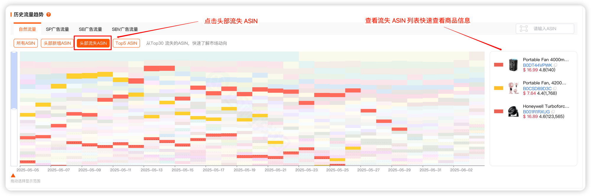 了解关键词近期头部流失 ASIN,了解排名变化趋势