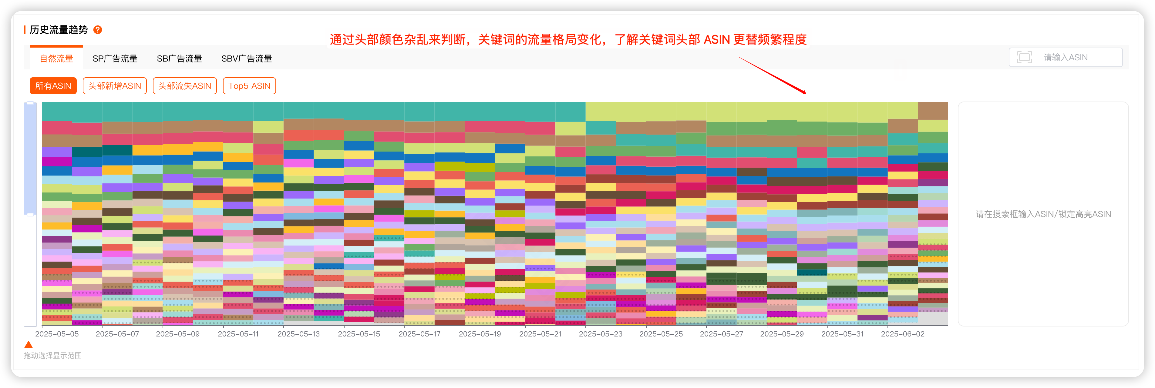 通过头部颜色杂乱来判断,关键词的流量格局变化,了解关键词头部 ASIN 更替频繁程度