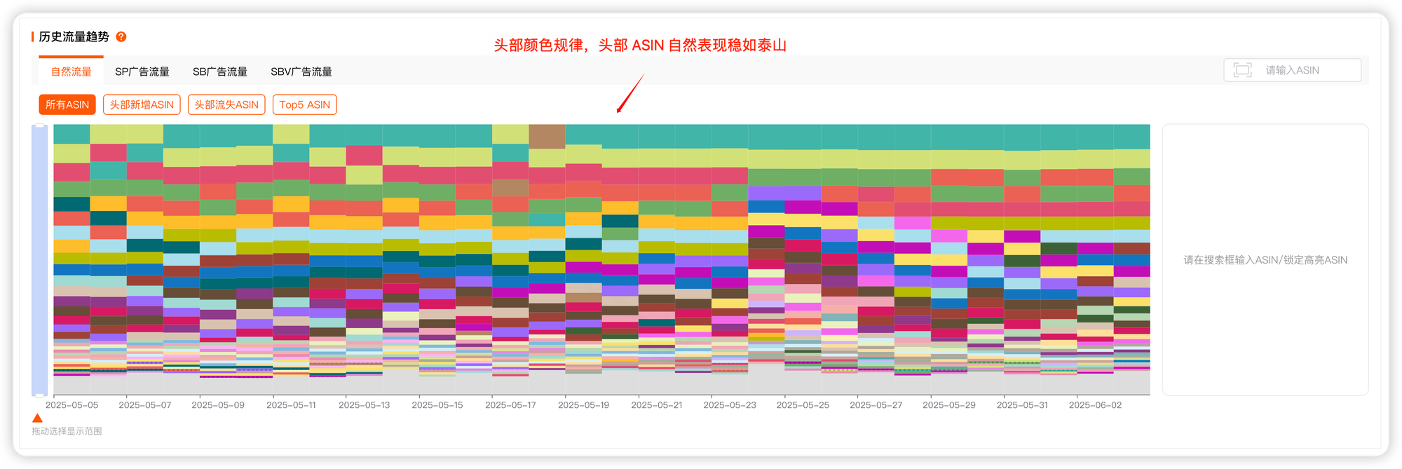 颜色越繁杂,变化越频繁,说明头部 ASIN 变化频繁,位置难守