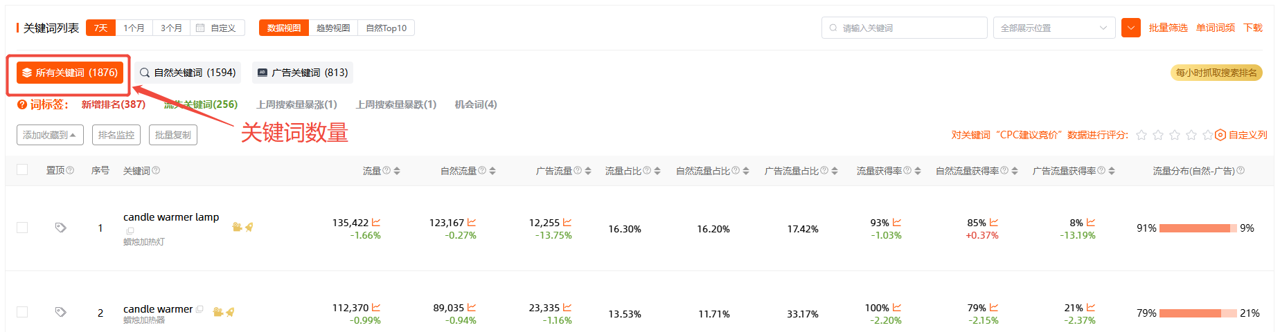数据指标问题 关键词数量是怎么统计的? 数据解释1、关键词数量:ASIN所筛选的时间段内出现在搜索结果页前3页自然位或广告位的关键词数量2、更新频率:1天更新1次3、为什么只抓取前 3 页的数据:根据用户的搜索习惯,一般翻到第3页后就不会翻页了。所以只有前 3 页具有较大的展示量,第 3 页以后,ASIN 的展示非常小。“反查关键词-关键词列表”数据使用1、在推新品时,通过关键词数量了解关键词推广进度2、与竞争对手进行对比,了解关键词数量差距情况 Previous Next
