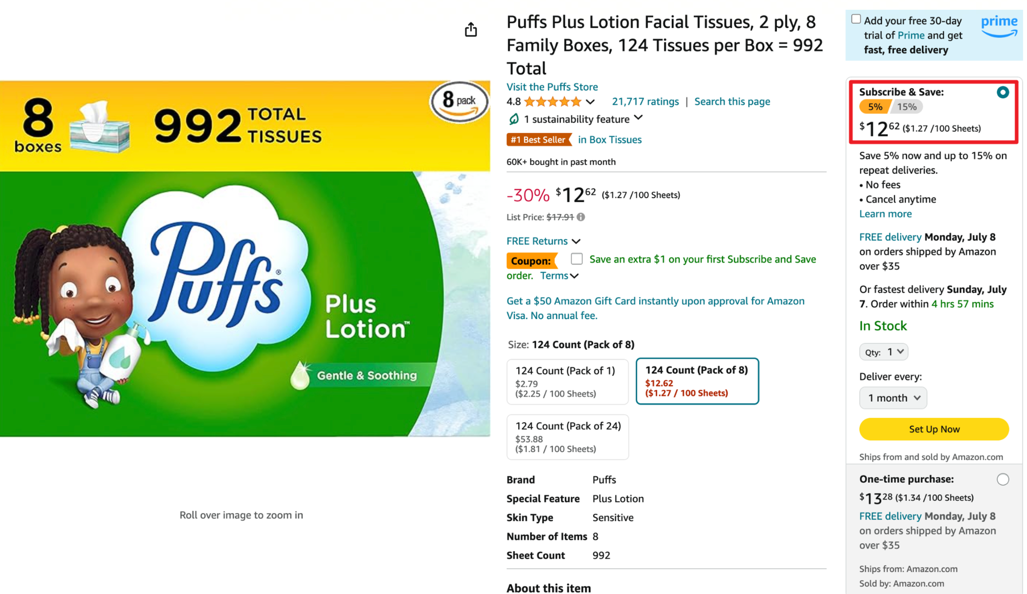这里的Subscribe指的是亚马逊官方提供的Subscribe & Save 服务,即订购定期的配送服务就能够获得更大的折扣和免运费优惠。