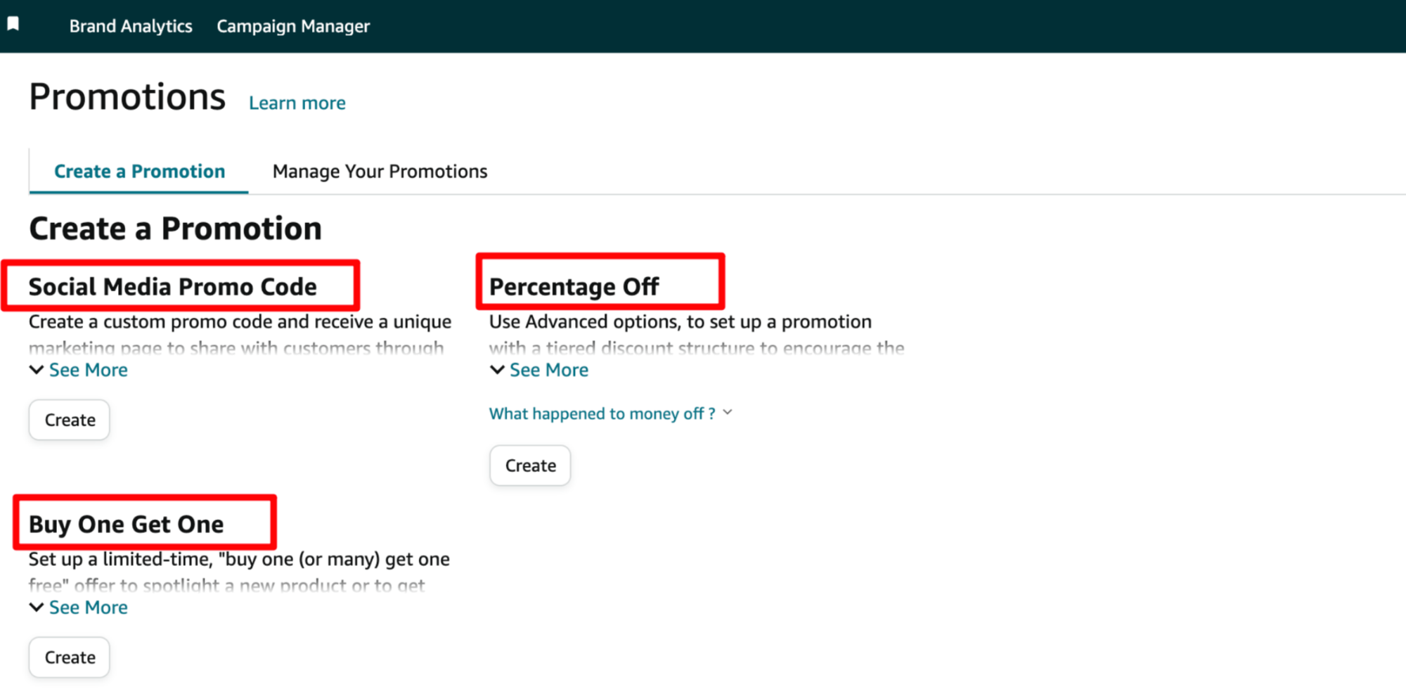 亚马逊官方推出的一种促销活动,包括:Social Media promo code、Percentage Off和Buy One Get One。(下图是在亚马商家后台对Promotion的设置)