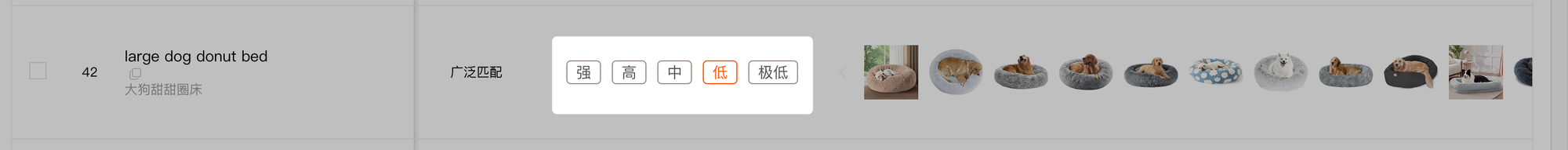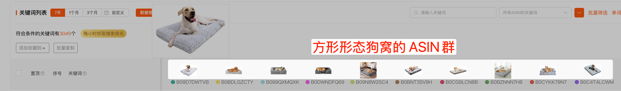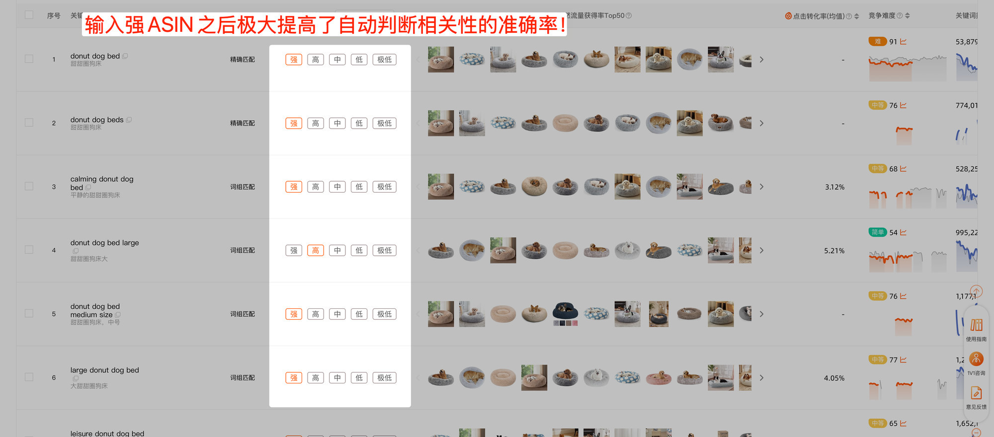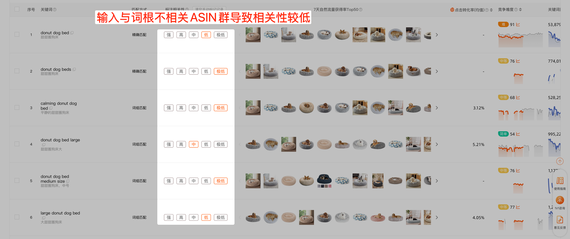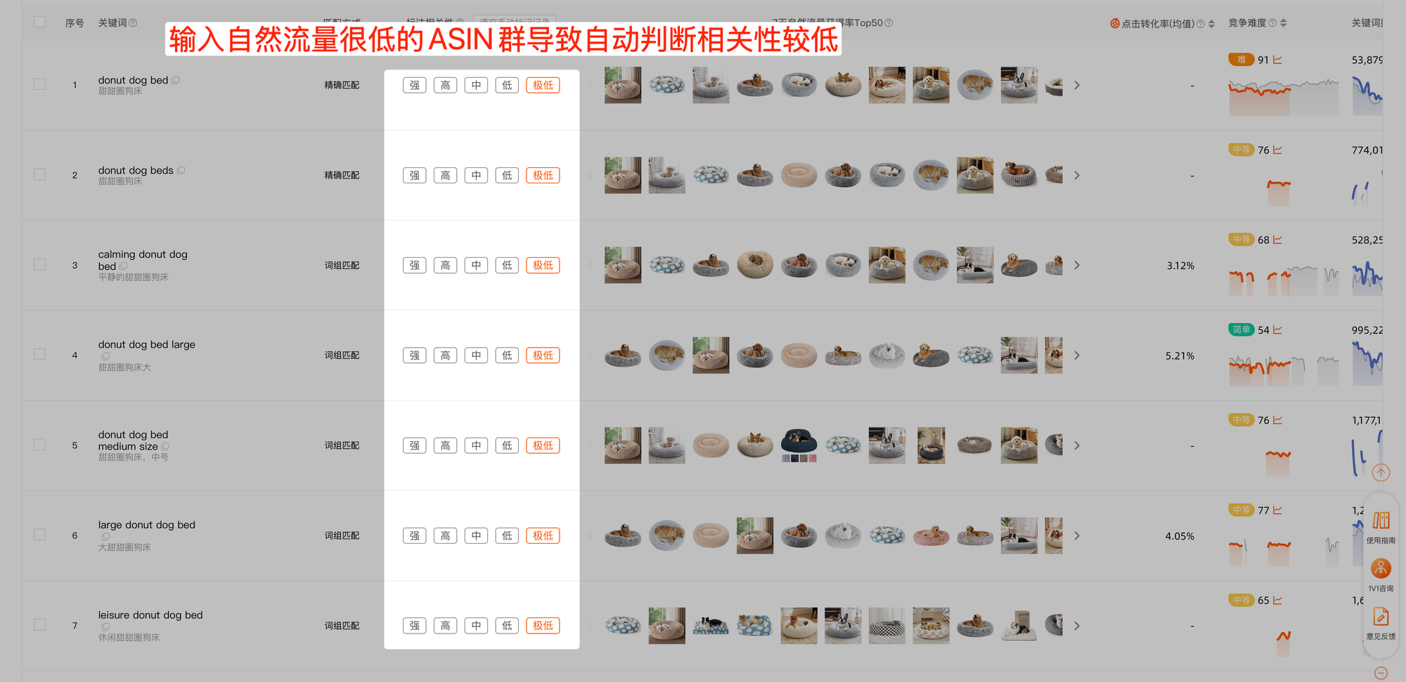 我们还是以上面这个关键词为例「donut dog bed」,我们使用另一批自然表现较差的ASIN作为自动判断相关性的依据