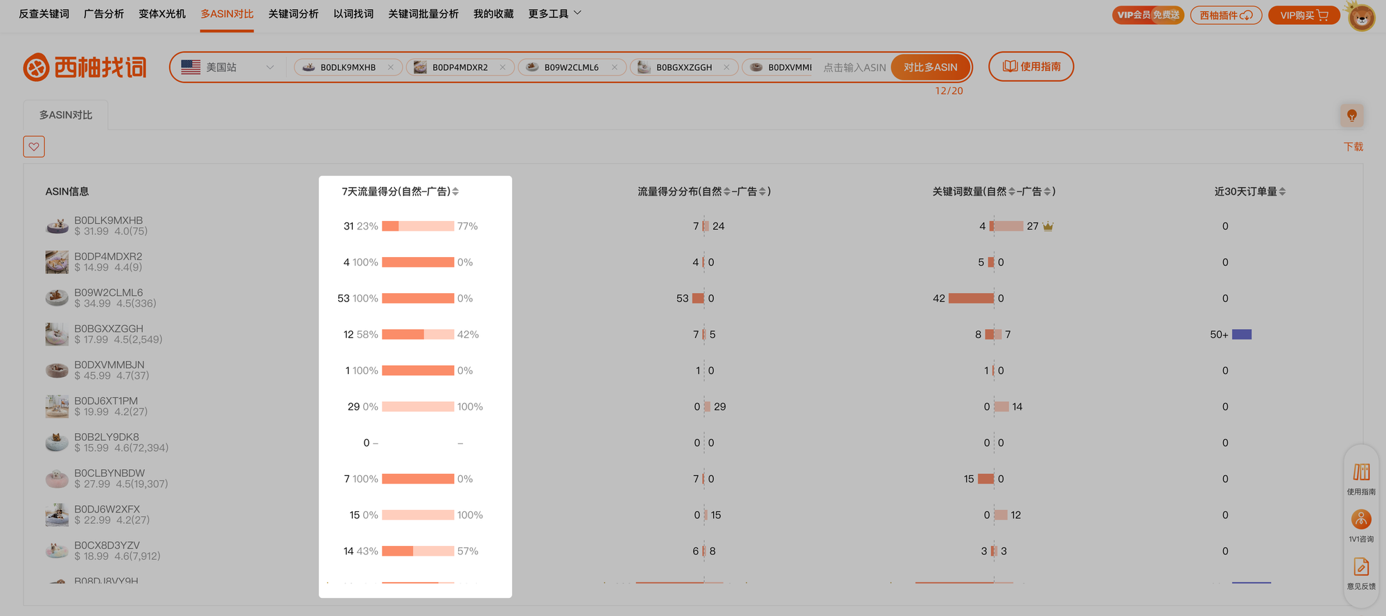 - 这批ASIN中获得自然流量的ASIN数量(越多的ASIN在这个词下获得自然流量,说明该词与这批ASIN的相关越高)