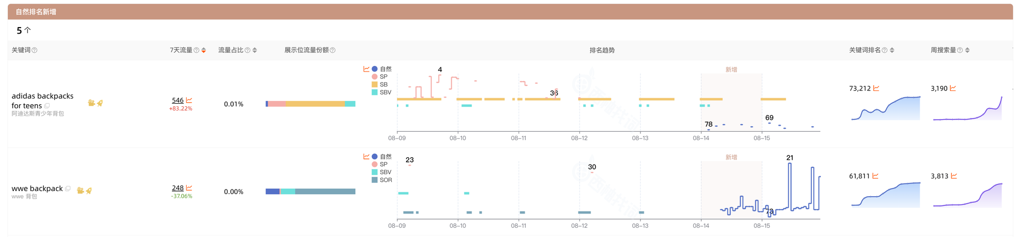 自然排名新增:昨日无排名,但今日出现自然排名的关键词;判断相关性后,决定是否要进行广告投放,稳定自然排名