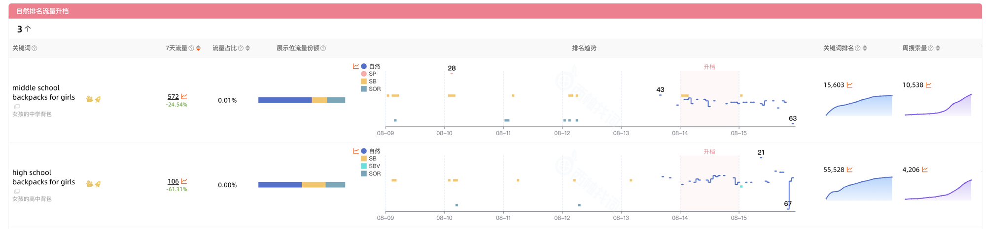 流量升档:今天相比昨天,流量向上升档的关键词;如:稀疏期升到震荡期,震荡期升到稳定期