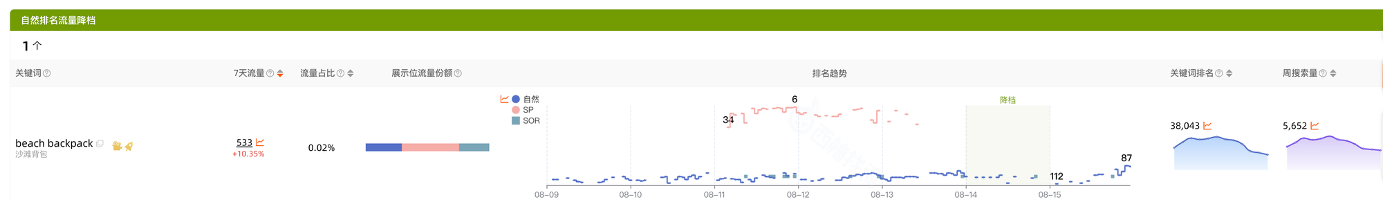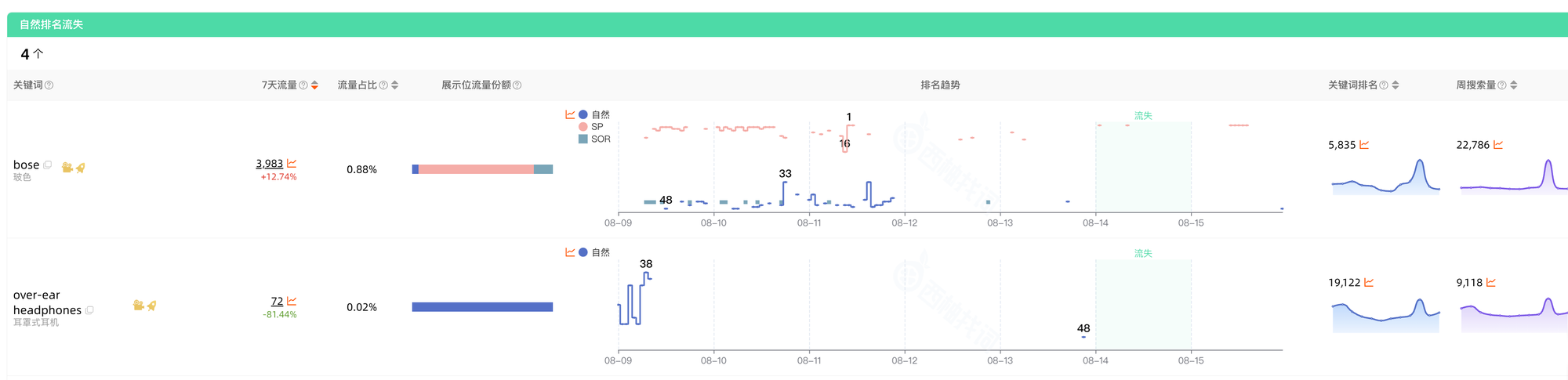自然排名流失:昨日有排名,但今日排名消失的关键词;判断关键词是否为流量来源核心词,如果是的话,则需要重点进行关注