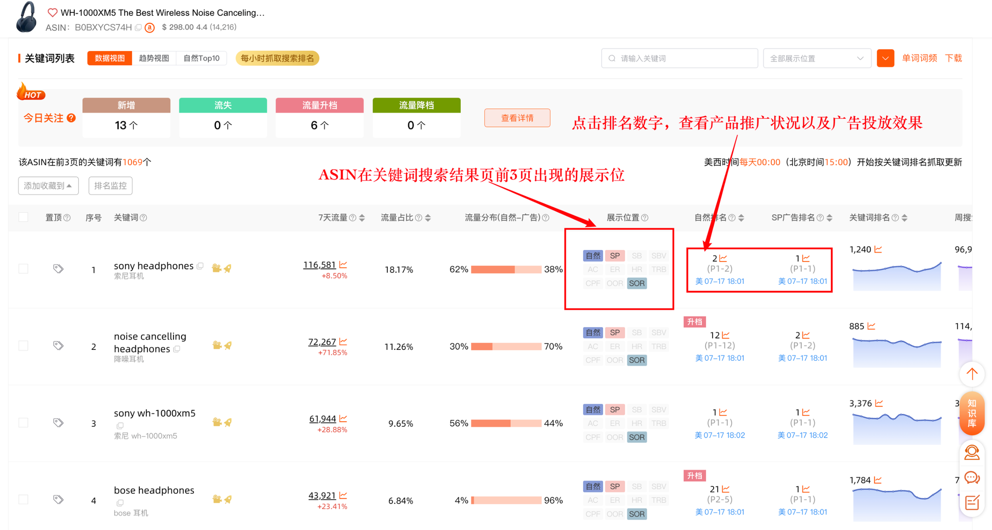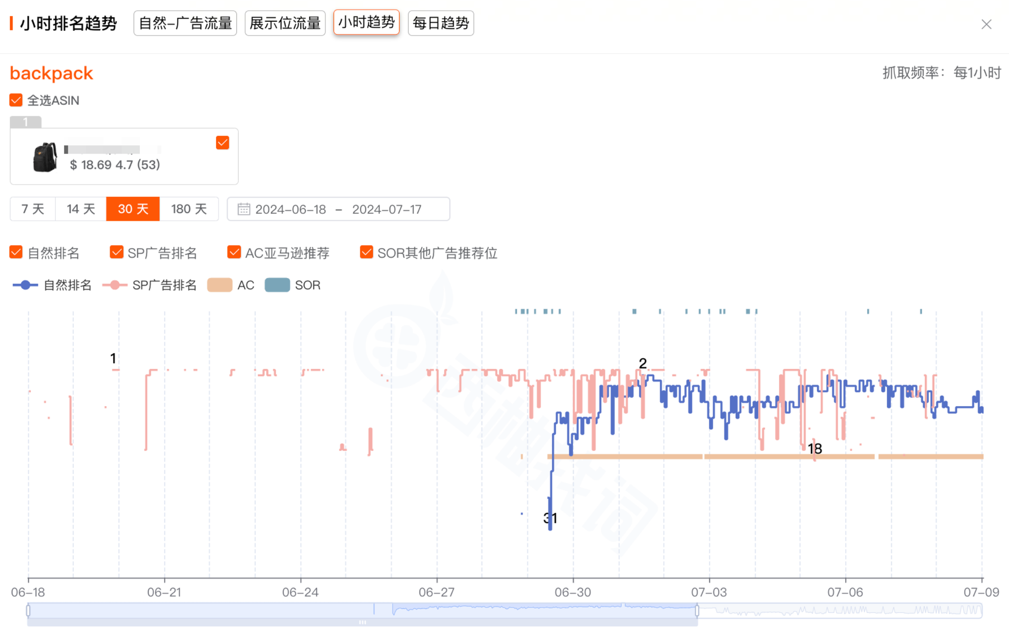 点击“自然排名”或“广告排名”数字,可查看ASIN在关键词下的历史排名变化趋势以及广告投放效果。