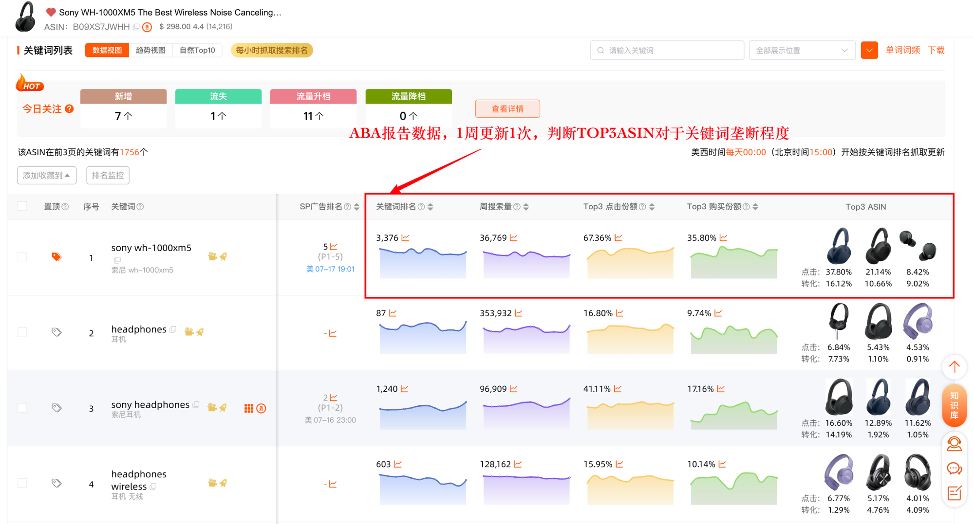 TOP3 点击份额:ABA 报告中点击最多的 3 个 ASIN 的点击份额之和,代表点击集中度