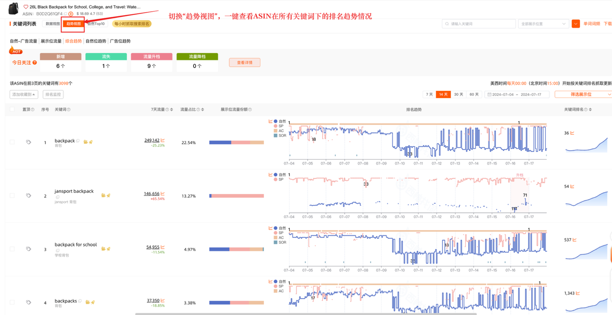 切换”趋势视图“,可以一键查看ASIN在所有关键词下的排名表现情况