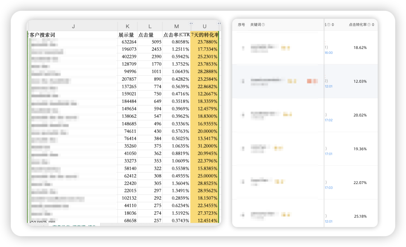 步骤:下载亚马逊卖家后台“搜索广告报告”--“商品推广搜索词报告”获取“7 天的转化率”数据,对比反查出来的关键词转化率,看看是否高于同行平均水平。