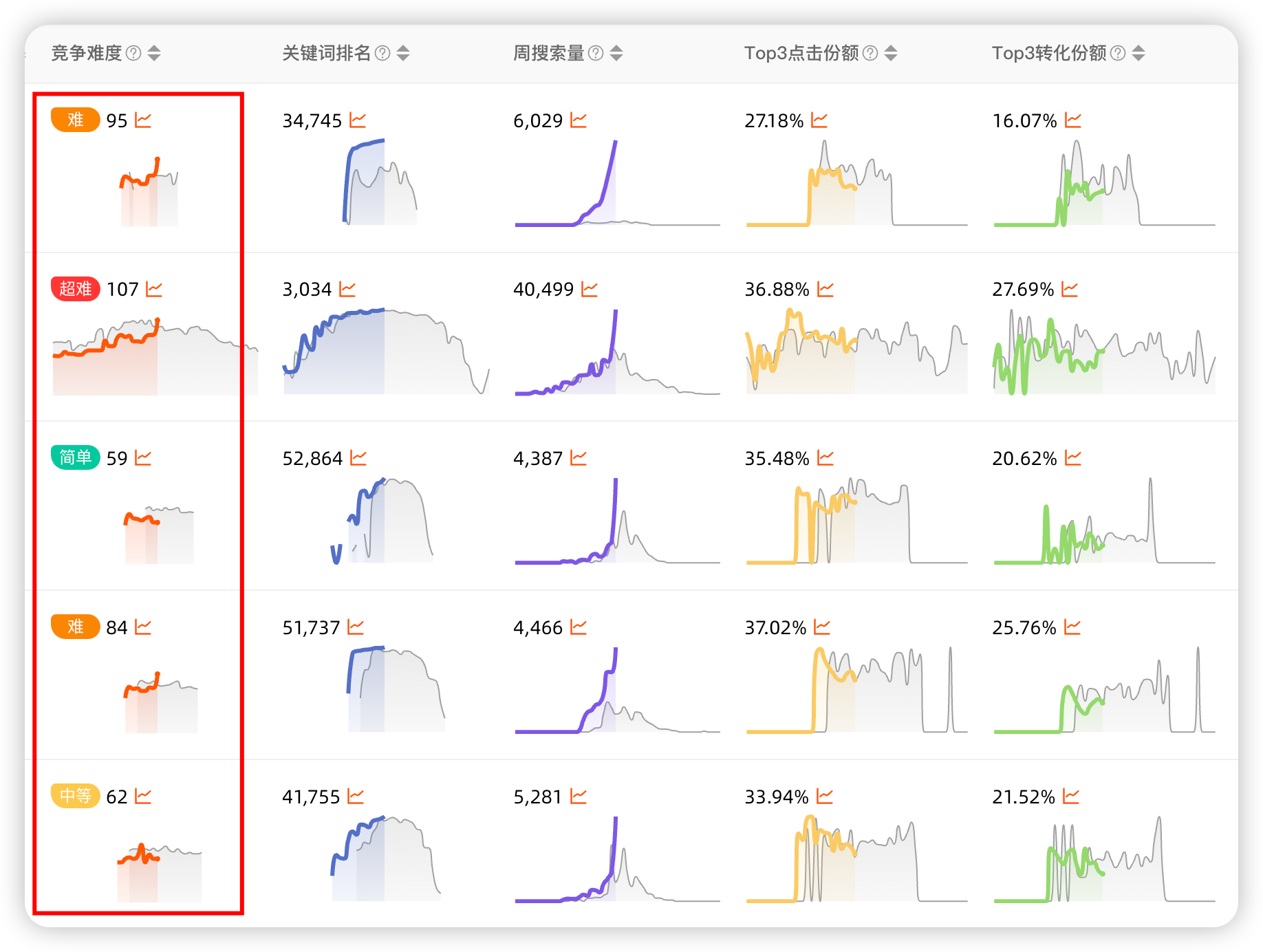 关键词的竞争难度:根据关键词的搜索量、竞争度、广告竞争度等数据综合计算得出,分数越高表示该关键词的竞争越激烈。