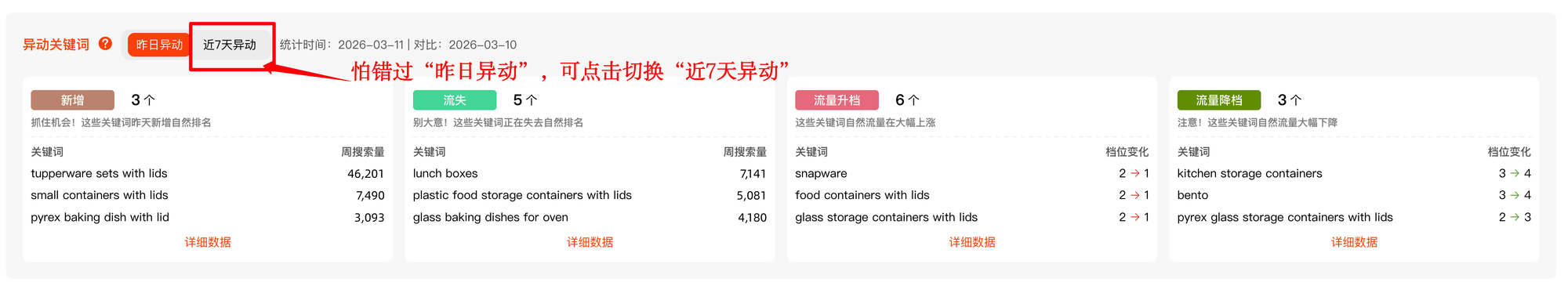 “异动关键词”提供了4个维度数据,自然排名“新增”、“流失”、“流量升档”、“流量降档”