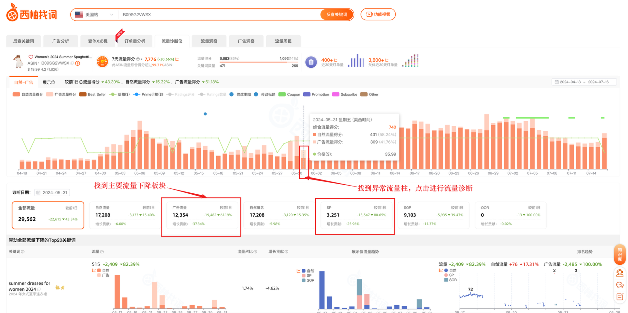 当ASIN出现异常流量变化情况时,我们可以通过“流量诊断仪”帮助更加深入的分析流量,从ASIN流量变化到关键词流量分析。