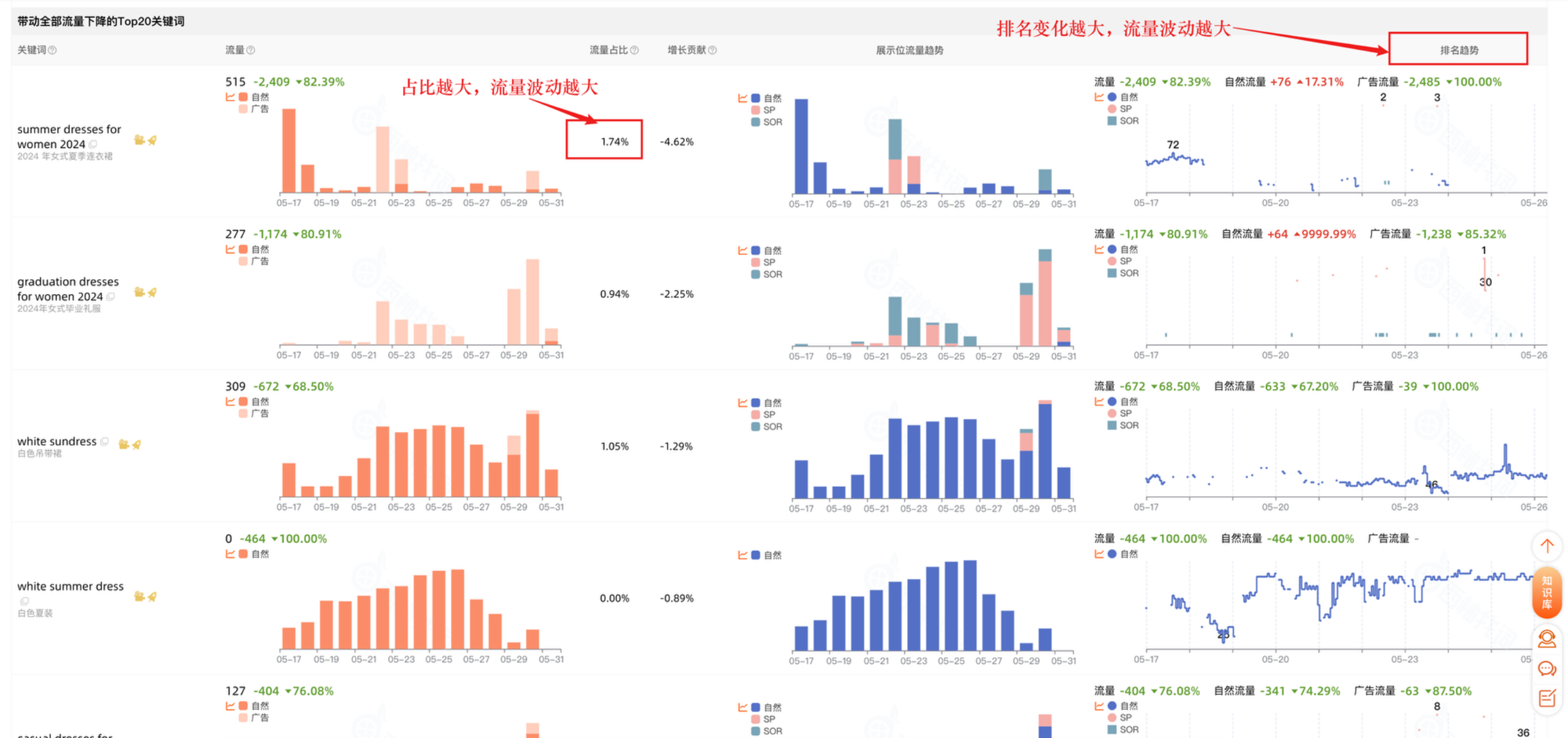 1、关键词流量占比:首先判断关键词对于ASIN贡献的流量占比,流量占比越大,说明该关键词对ASIN贡献的流量越多。如果流量占比大的关键词出现了波动,就会导致关键词会有大幅的流量变化