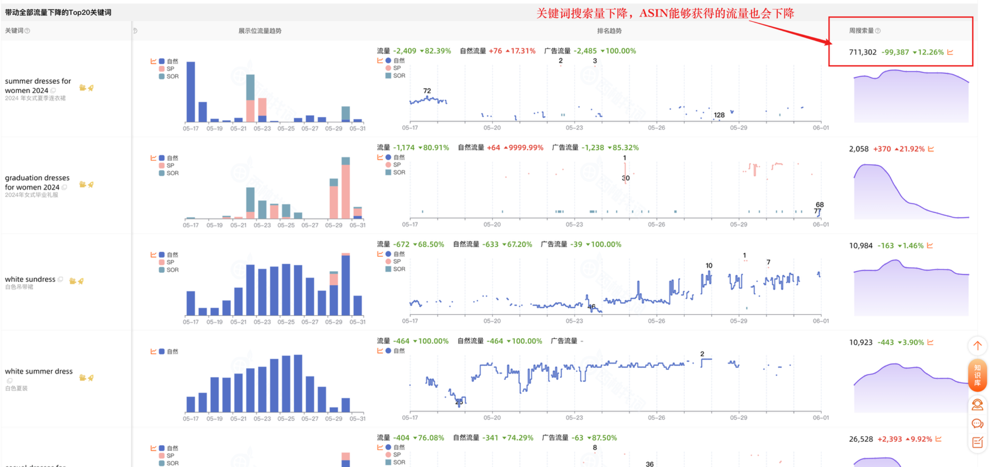2、关键词排名变化:其次可以看ASIN在关键词搜索结果页的关键词排名变化情况,排名下降,ASIN获得的流量也会下降