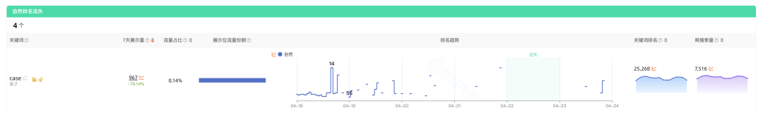 为了帮助我们更加精准地捕捉到产品的流量机会以及潜在流失风险,及时调整策略,更加有效地把握住窗口期。“异动关键词”提供了4个维度数据,自然排名“新增”、“流失”、“流量升档”、“流量降档”