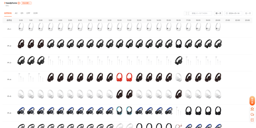 在自然放映机中, 我们能够看到每小时自然位置上的ASIN都是哪些。我们能够知道ASIN自然排名越靠前,自然排名越稳定。